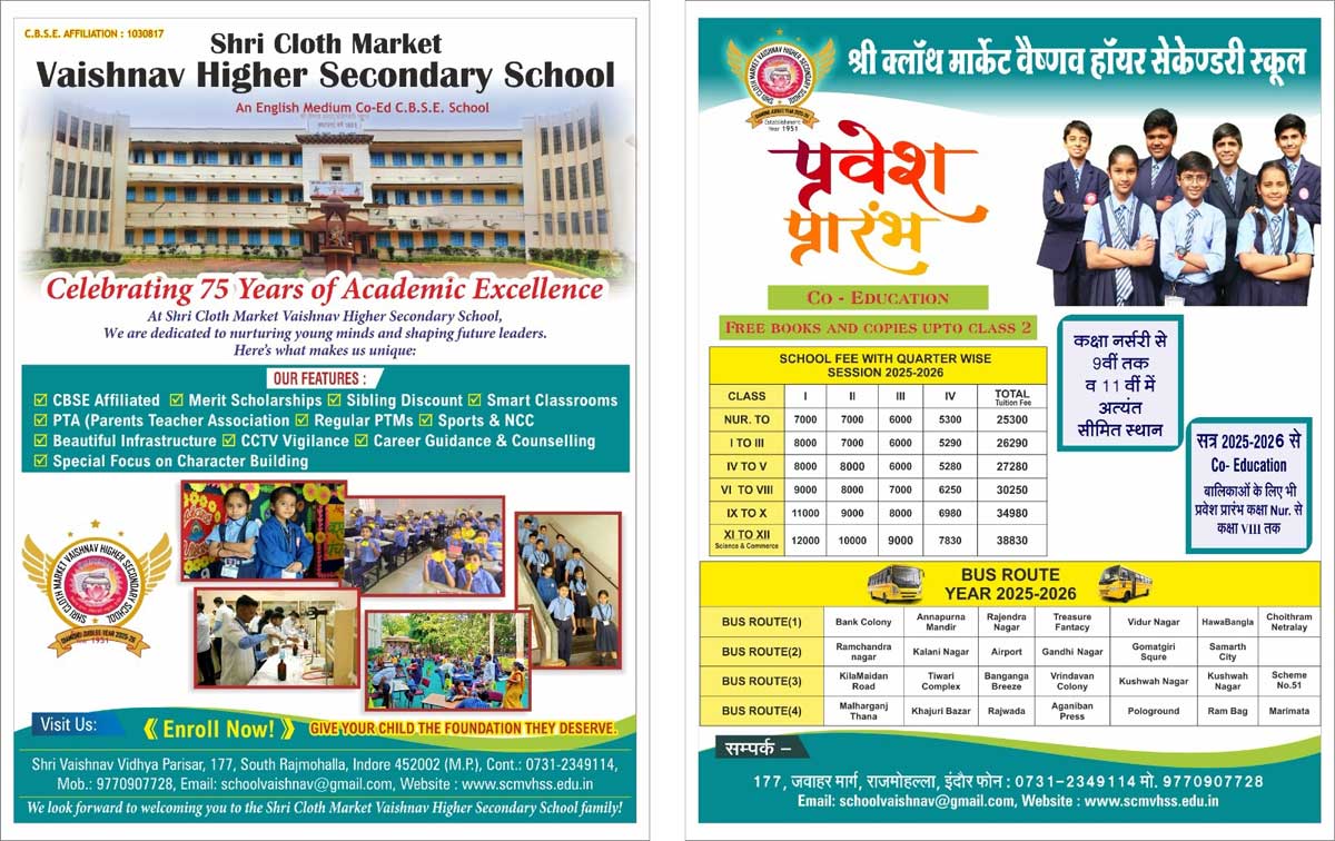 Late shri GopiKishan ji Agrawal was the founder head (President ,Chairman). It is because of the faith and immense the truth of the member of the committee that the sapling which was planted 60 year ago an turned itself into a big and vast tree. Shri Cloth Market Vaishnav Higher Secondary School is the other name of the faith sainthood and simplicity at its best . After Independence, in the time of renovation of the business class, Shri Vaishnav Higher Secondary School was the result.